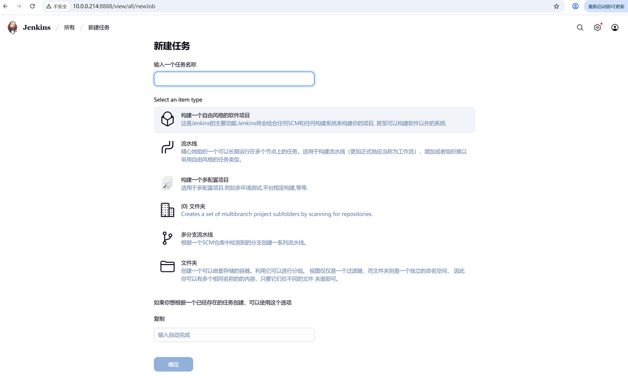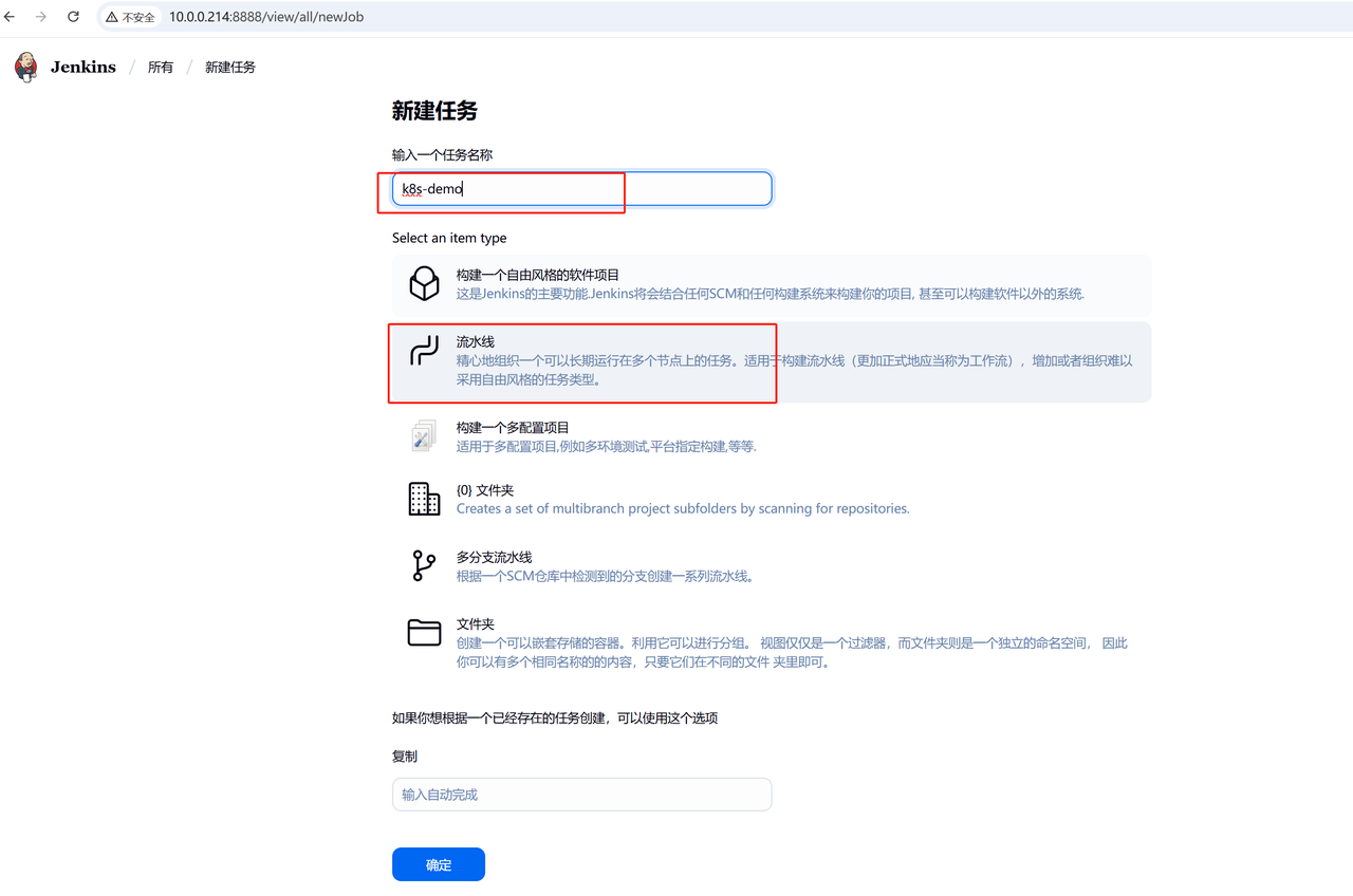点击“新建任务”,输入名称并选择“流水线”(pipeline),然后点击确定。