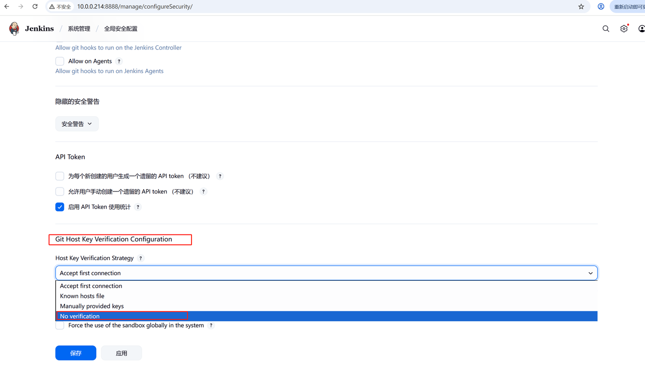 Jenkins 中的 :全局安全配置 host key verification configuration修改为不验证
