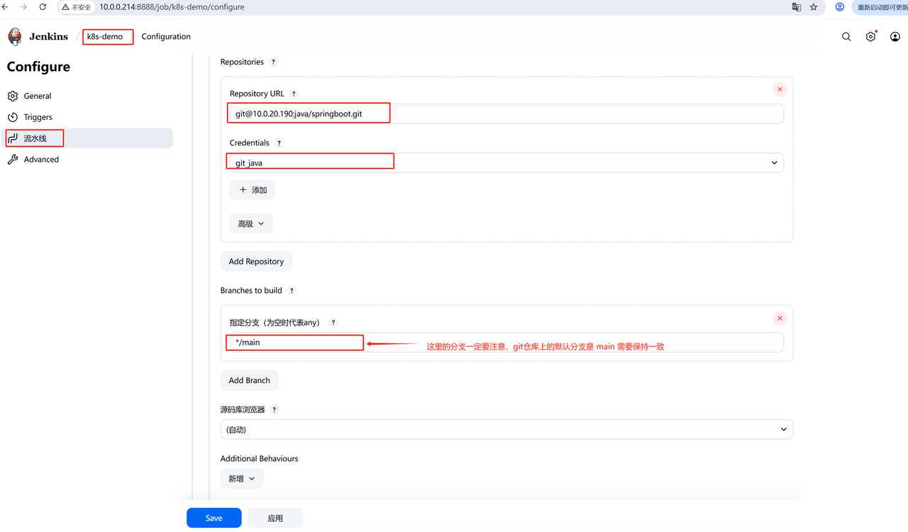 进入任务的配置界面,在流水线(pipeline)设置部分,选择“Pipeline script from SCM”。SCM选项选为“Git”,配置好工程的git地址以及获取代码的凭证信息。然后在“Additional Behaviours”中添加“Clean before checkout”。
