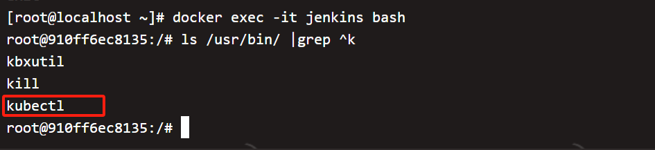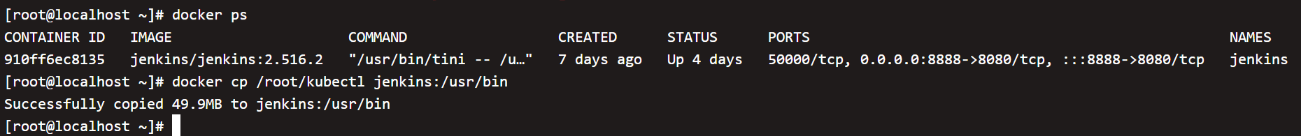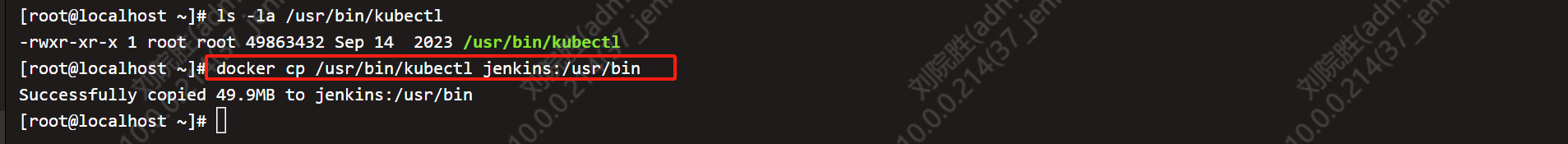 [root@localhost ~]# docker cp /root/kubectl jenkins:/usr/bin