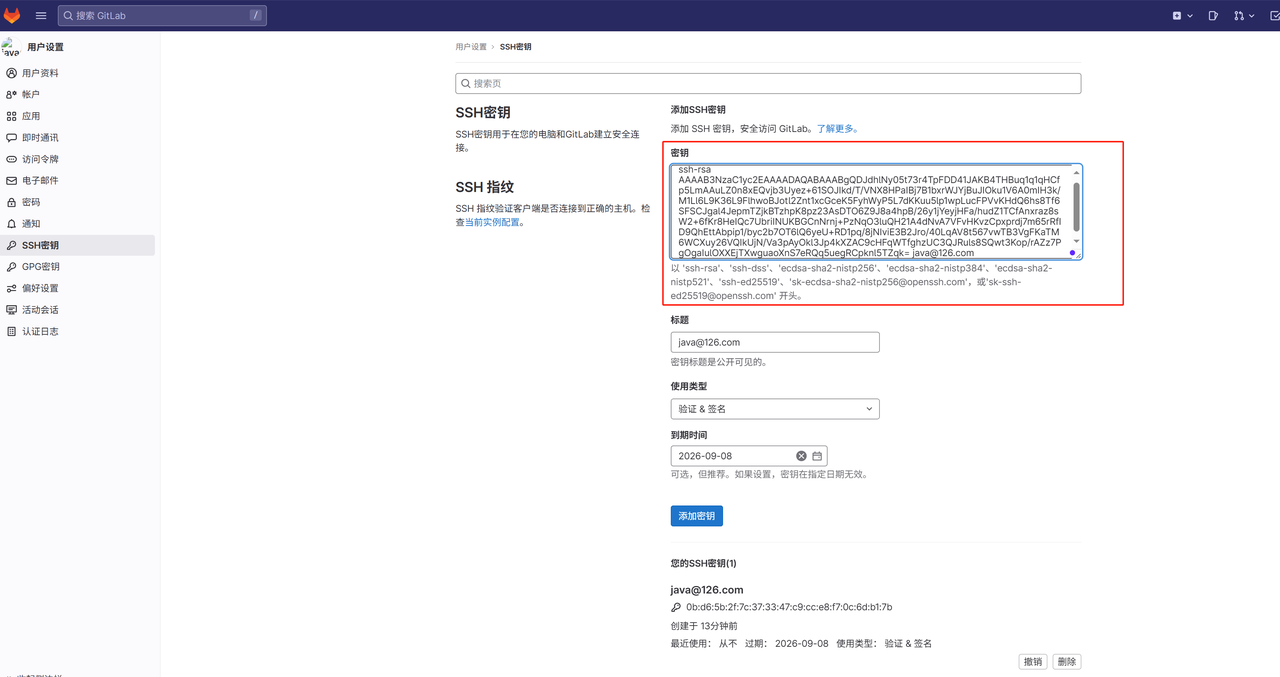 在git仓库上创建java@126.com并切换至此目录用户设置中SSH密钥添加此公钥id_rsa.pub