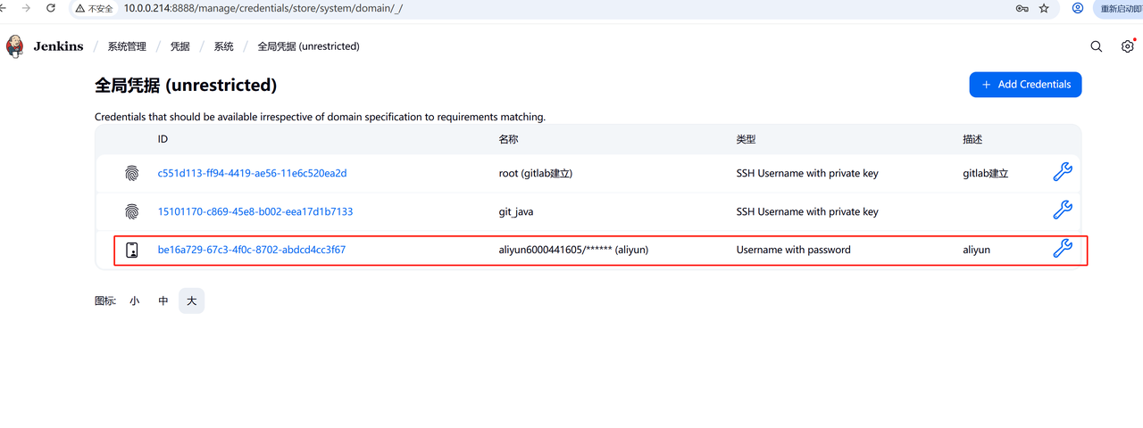 创建用户名密码类型的aliyun registry镜像仓库凭证,ID为aliyun username with password