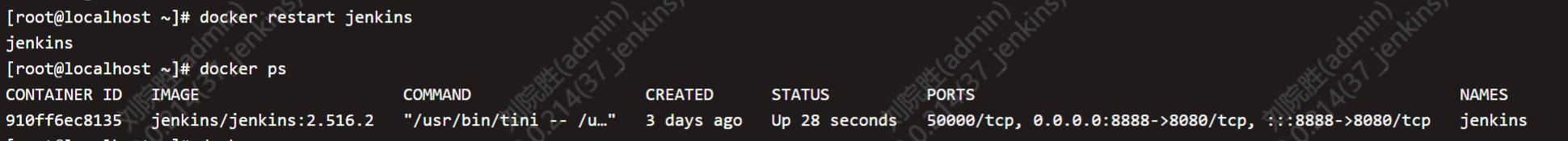 [root@localhost ~]#docker run -d -u root -p 8888:8080 -v /data/jenkins_home:/var/jenkins_home -v /var/run/docker.sock:/var/run/docker.sock -v /usr/bin/docker:/usr/bin/docker -v /etc/docker:/etc/docker -v /usr/local/jdk17:/usr/local/java -v /usr/local/maven:/usr/local/maven -v /etc/localtime:/etc/localtime:ro -e JAVA_OPTS=-Dhudson.model.DownloadService.noSignatureCheck=true –name jenkins jenkins/jenkins:2.516.2