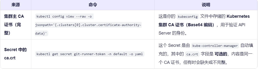 - 为什么 git-runner-token Secret 中的 ca.crt 可能不一样或为空?