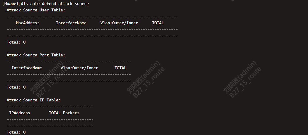 1、怀疑设备内网、存在ARP攻击,配置跟踪溯源功能。配置命令如下:cpu-defend policy 1auto-defend enableauto-defend threshold 40 //可适当调整建议不要太小auto-defend protocol allauto-defend trace-type source-ip source-mac source-portvlanauto-defend alarm enable#cpu-defend-policy 1 global //在全局应用 cpu-defend-policy 1 2、使用命令display auto-defend attack-source在网络出现异常时查询设备是否存在攻击。<Huawei>display auto-defend attack-source Attack Source User Table: ————————————————————————- MacAddress InterfaceName Vlan:Outer/Inner TOTAL ————————————————————————- 0cda-xxxx-cf00 GigabitEthernet0/0/1 0 368 1414-xxxx-7696 GigabitEthernet0/0/0 0 7152 ————————————————————————- Total: 2 Attack Source Port Table: —————————————————– InterfaceName Vlan:Outer/Inner TOTAL —————————————————– GigabitEthernet0/0/1 0 368 GigabitEthernet0/0/0 0 23472 —————————————————– Total: 2 Attack Source IP Table: ————————————- IPAddress TOTAL Packets ————————————- 219.x.x.3 368 58.x.x.1 7152 ————————————- Total: 2<Huawei>3、发现内网某用户发送攻击报文(外网接口如增涨不大不做考虑),源地址为58.x.x.1,源MAC为1414-xxxx-7696,通过用户接入的端口逐层排查该用户接入的交换机端口,找到该接入用户,使用杀毒软件查杀病毒后问题解决。