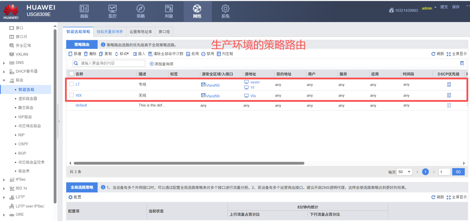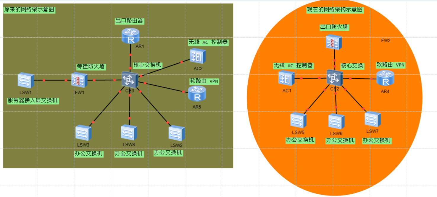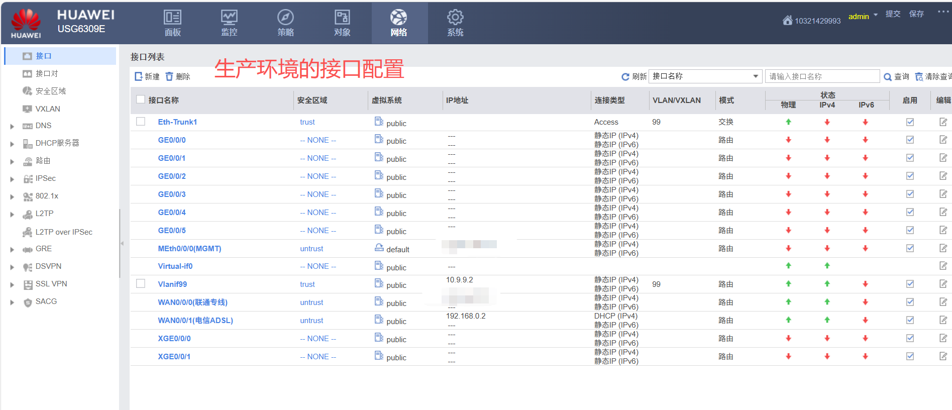 此防火墙原本是作为旁挂模式部署,在核心交换的至内部服务器的入口处,后面由于公司规模的缩小,原来的华为路由器就有此防火墙替代了。