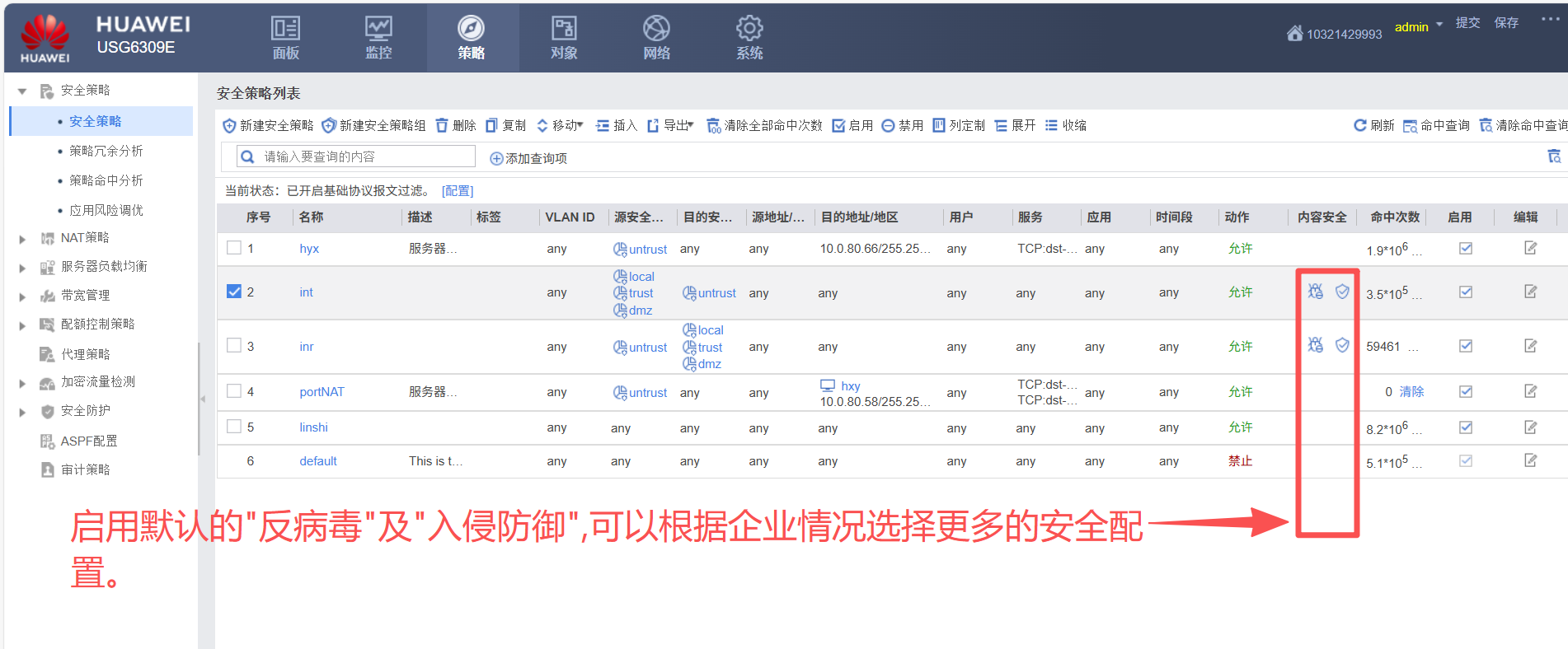 防火墙要起到安全的作用这里的内容安全选项越精细越安全,如果公司业务比较复杂对管控不是很严格,也建议最起码配置“反病毒”及“入侵防御”