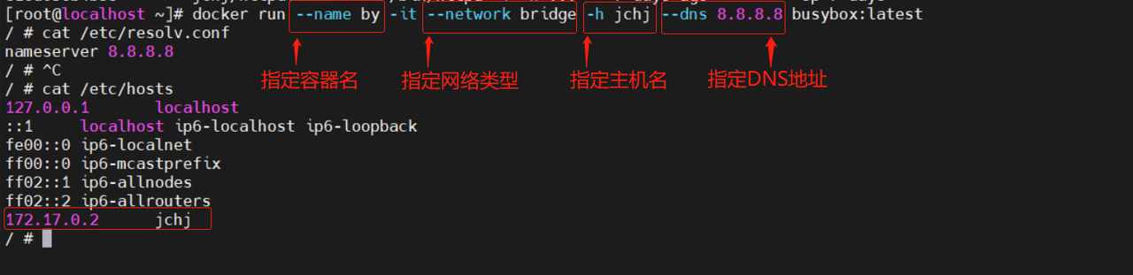 [root@localhost ~]# docker run –name by -it –network bridge -h jchj –dns 8.8.8.8 busybox:latest