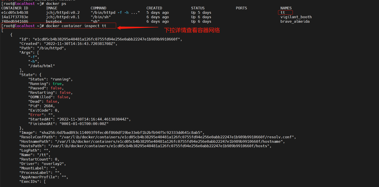 [root@localhost ~]# docker container inspect tt 查看容器网络