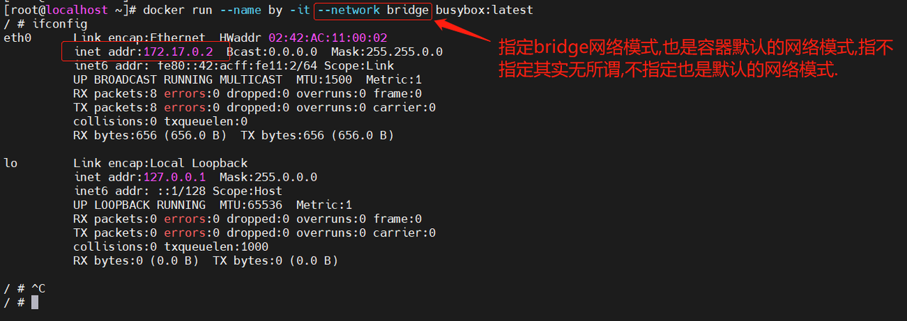 [root@localhost ~]# docker run –name by -it –network bridge busybox:latest 指定bridge网络模式。