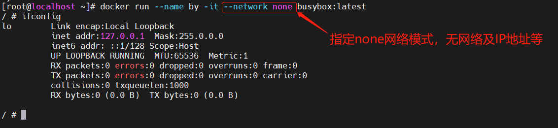 [root@localhost ~]# docker run –name by -it –network none busybox:latest 指定none网络模式,这个Docker容器没有网卡称为封闭式容器。