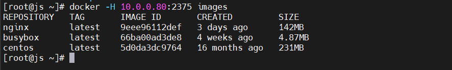 [root@js ~]# docker -H 10.0.0.80:2375 images 连接远程主机的docker