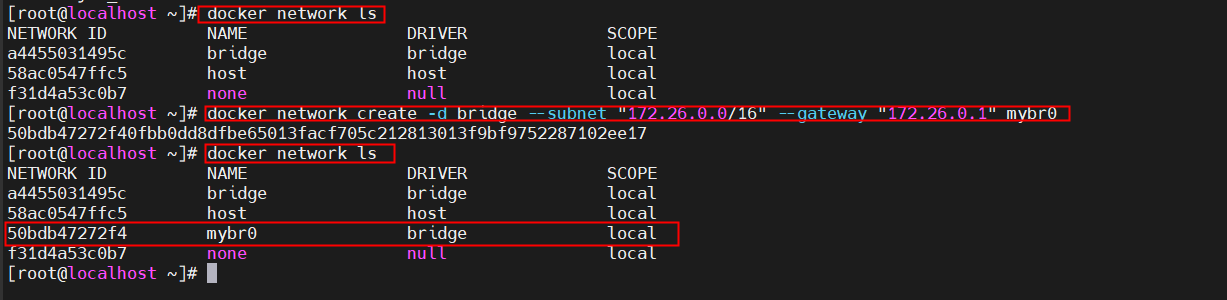 [root@localhost ~]# docker network create -d bridge –subnet “172.26.0.0/16” –gateway “172.26.0.1” mybr0