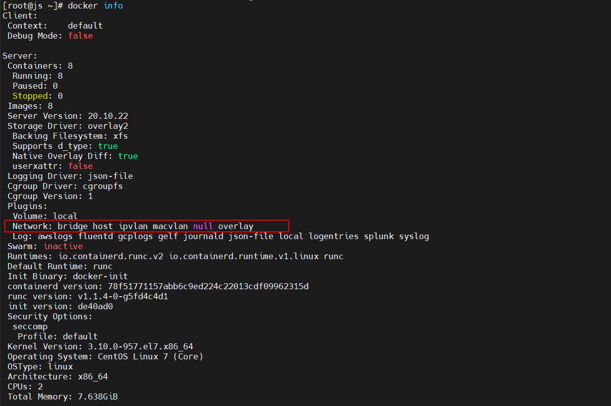 [root@js ~]# docker info 在docker的信息中可以看到还可以创建ipvlan、manvlan、overlay的桥。