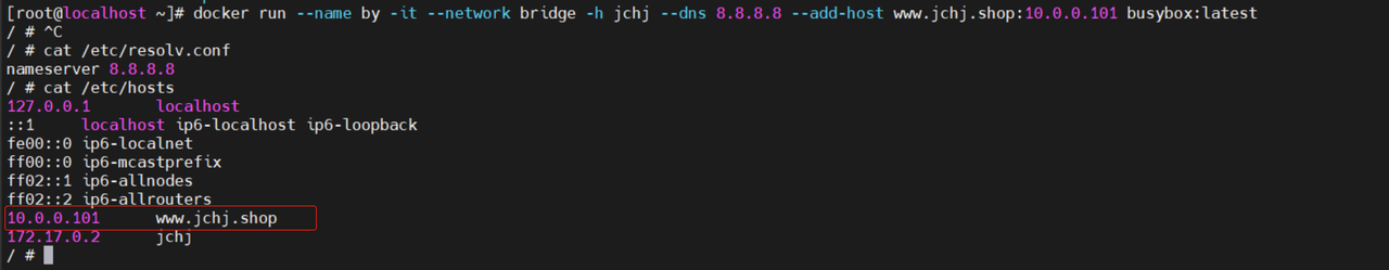 [root@localhost ~]# docker run –name by -it –network bridge -h jchj –dns 8.8.8.8 –add-host www.jchj.shop:10.0.0.101 busybox:latest 指定IP解析域名。