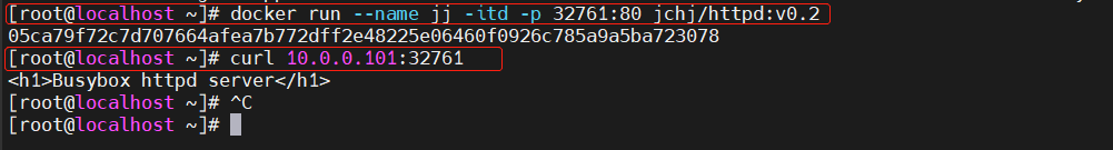 [root@localhost ~]# docker run –name jj -itd -p 32761:80 jchj/httpd:v0.2 把jj容器中需要对外暴露的80端口映射至宿主机的32761端口上,因此可以直接通过访问宿主机curl 10.0.0.101:32761来访问容器内的http服务。