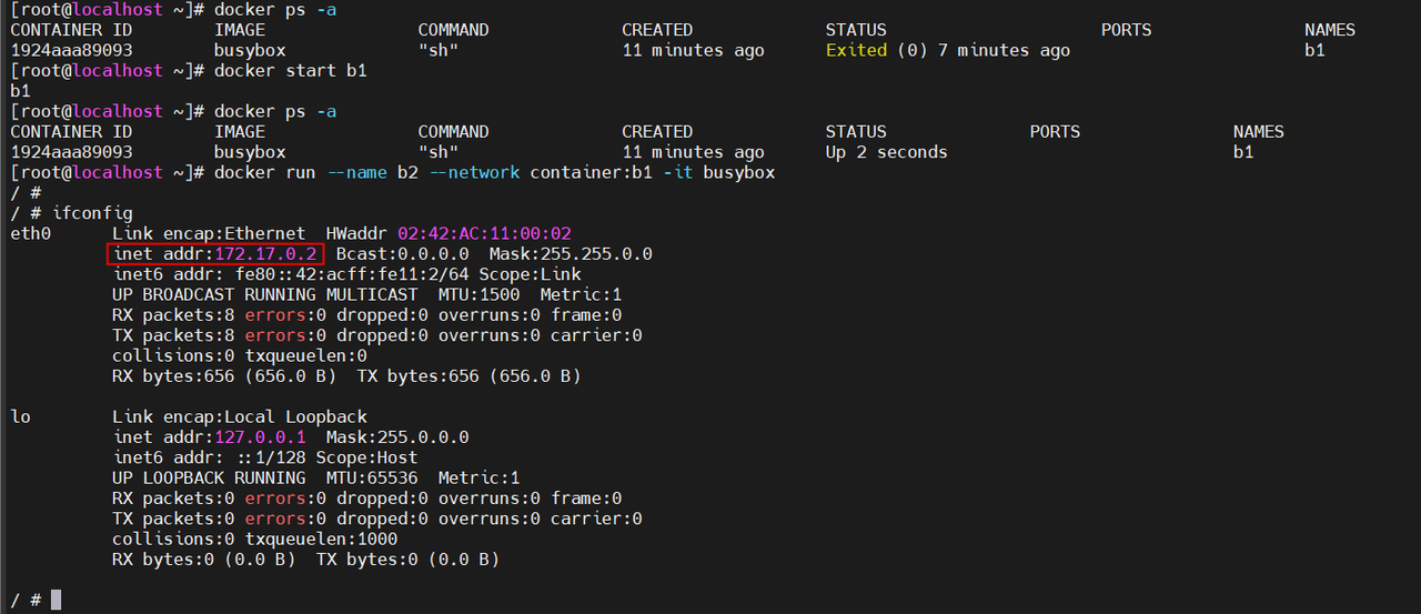 [root@localhost ~]# docker run –name b2 –network container:b1 -it busybox