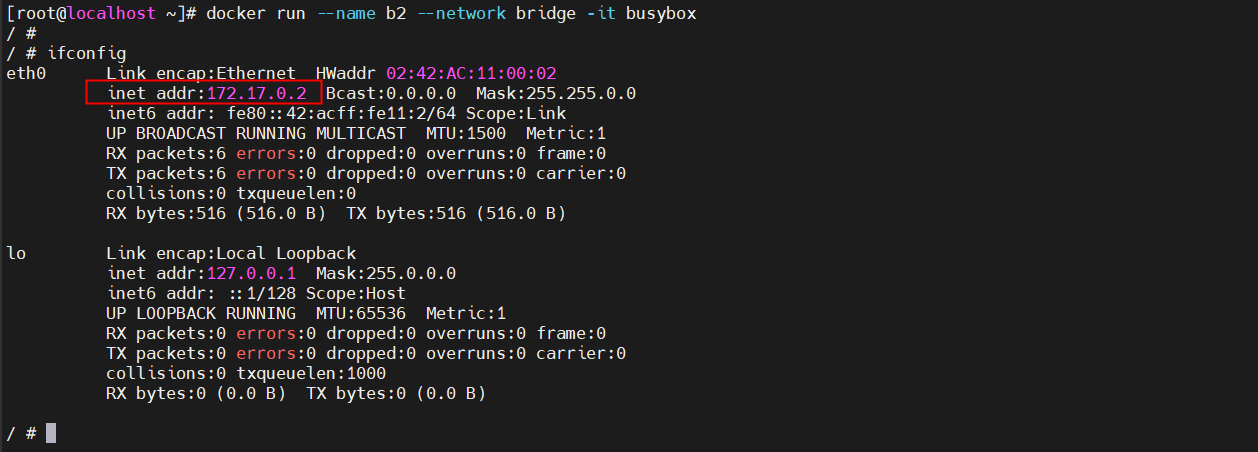 [root@localhost ~]# docker run –name b2 –network bridge -it busybox