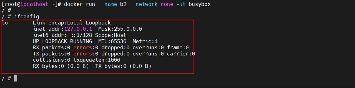 [root@localhost ~]# docker run –name b2 –network none -it busybox