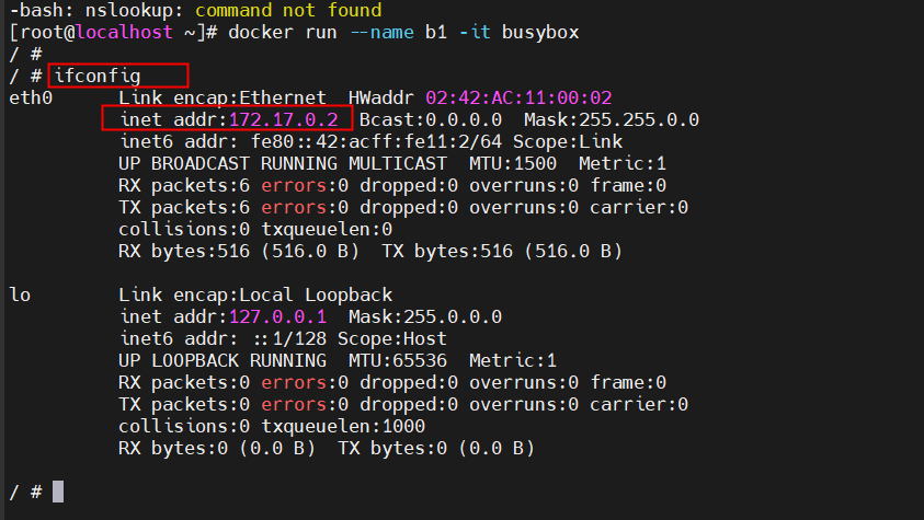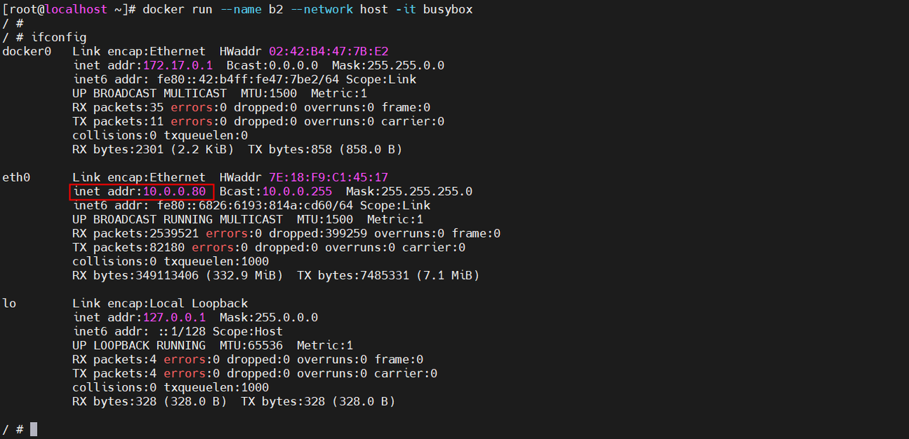 [root@localhost ~]# docker run –name b2 –network host -it busybox